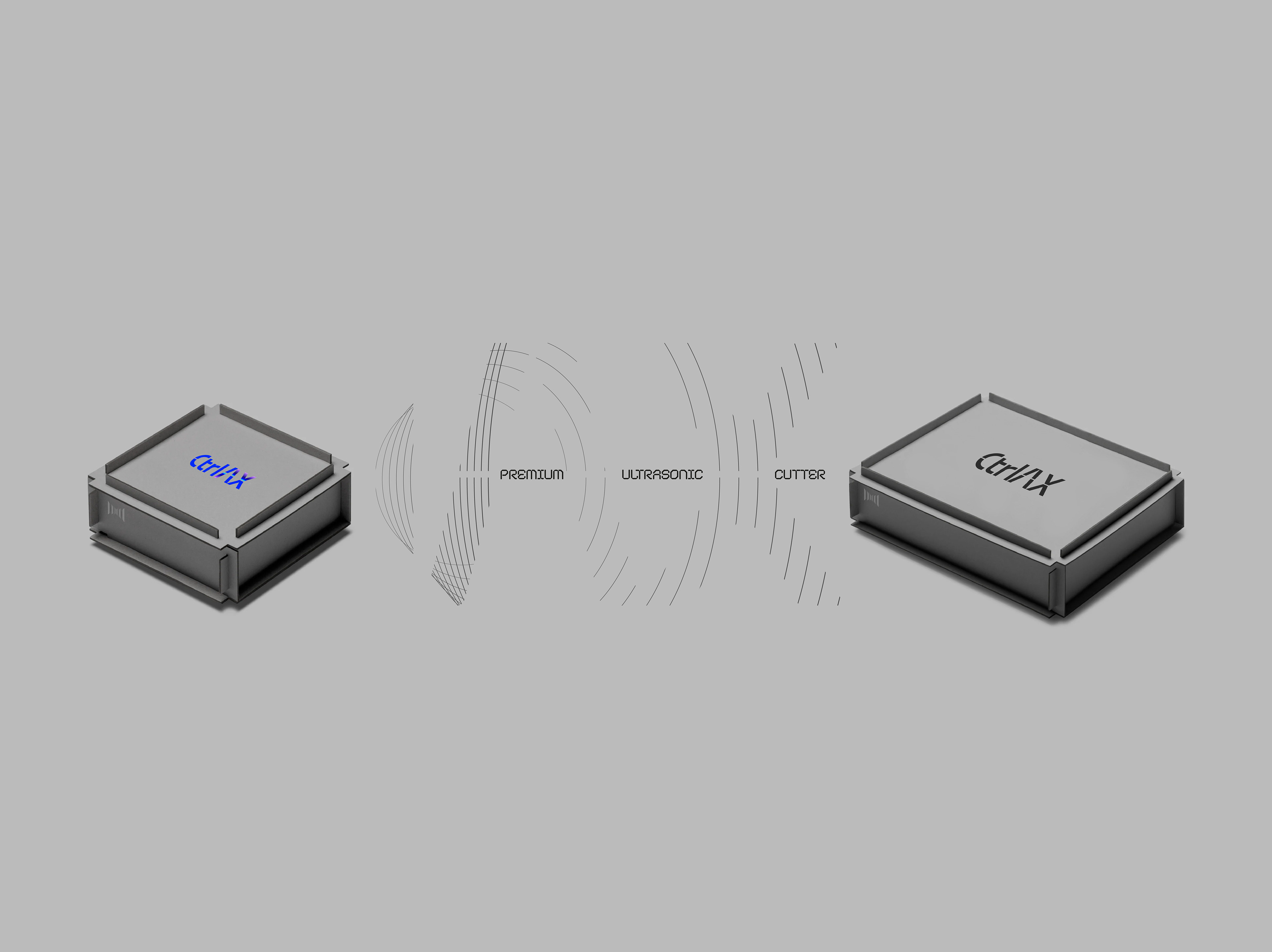 The letters "C," "A," and "X" are strategically cut to represent the CtrlAX cutting process, additionally, subtle ultrasonic graphics are embedded within the "A" and "X" for a touch of technological flair.